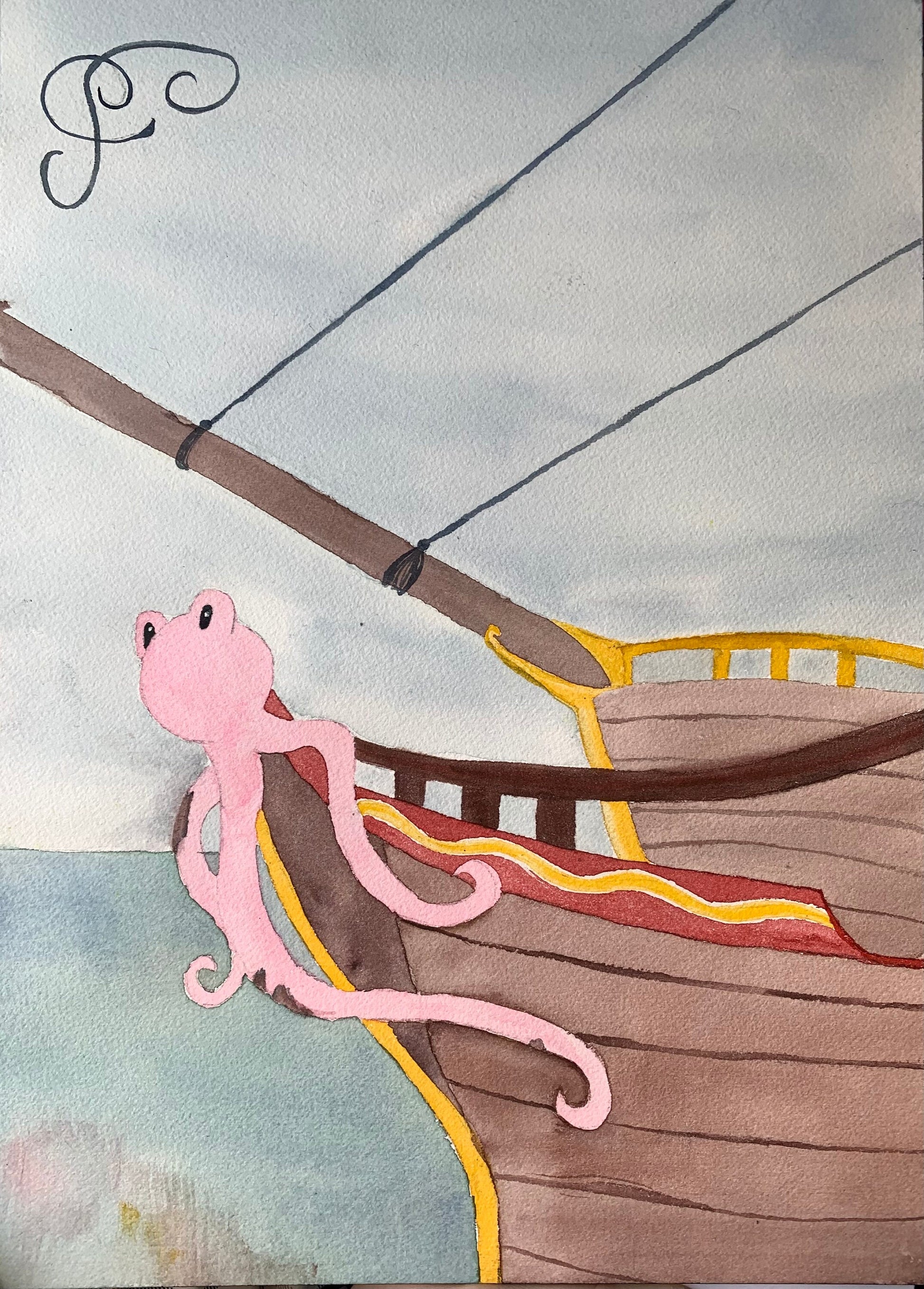 F is for figurehead shows a frogtopus figurehead named pretzel on the front of a boat *not the original watercolor painting it is a print
