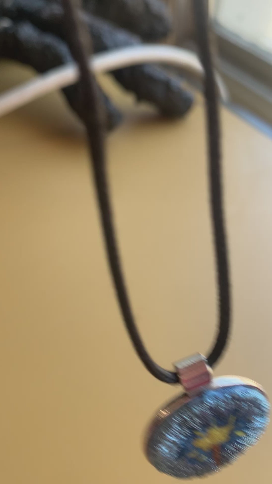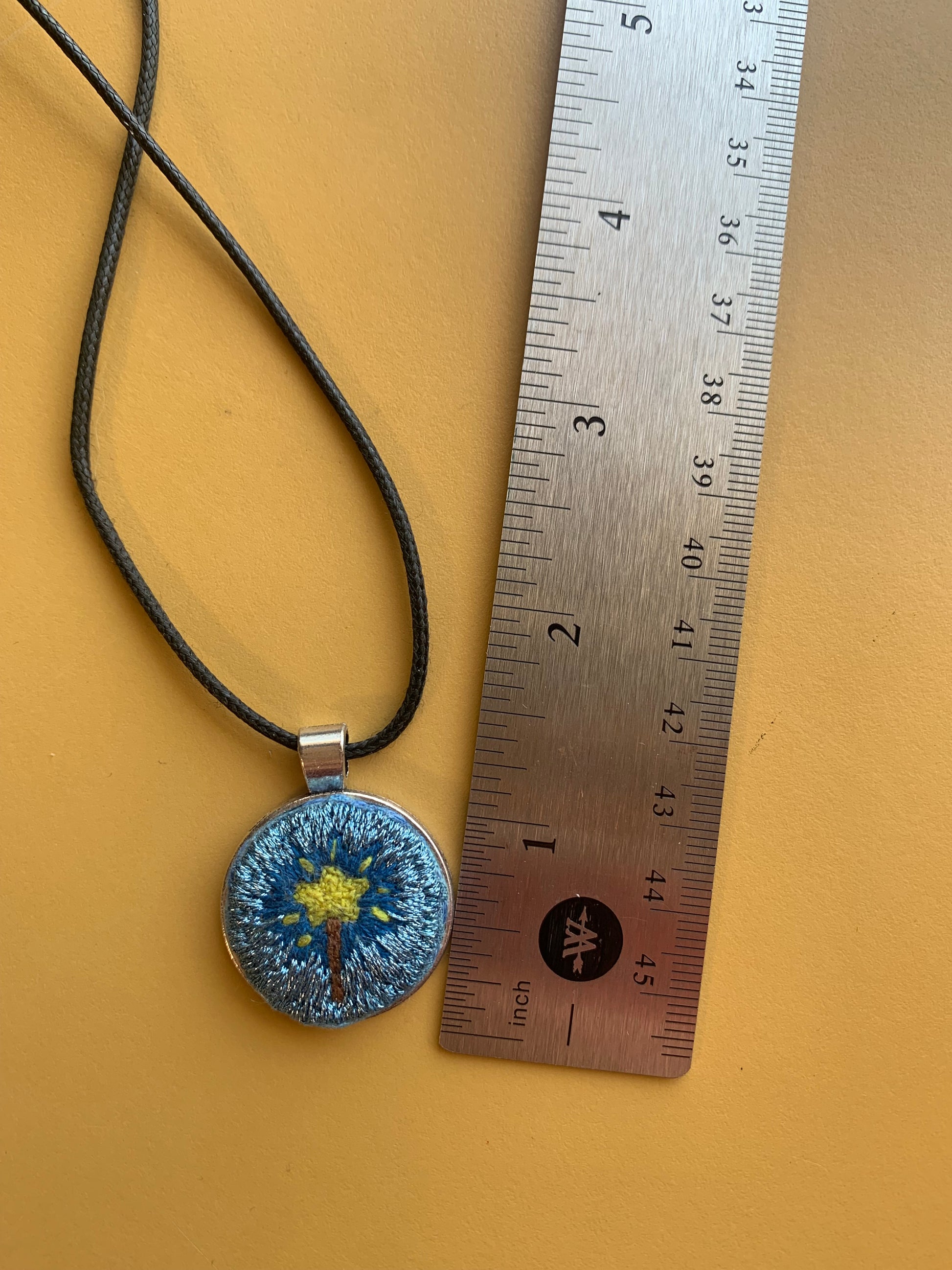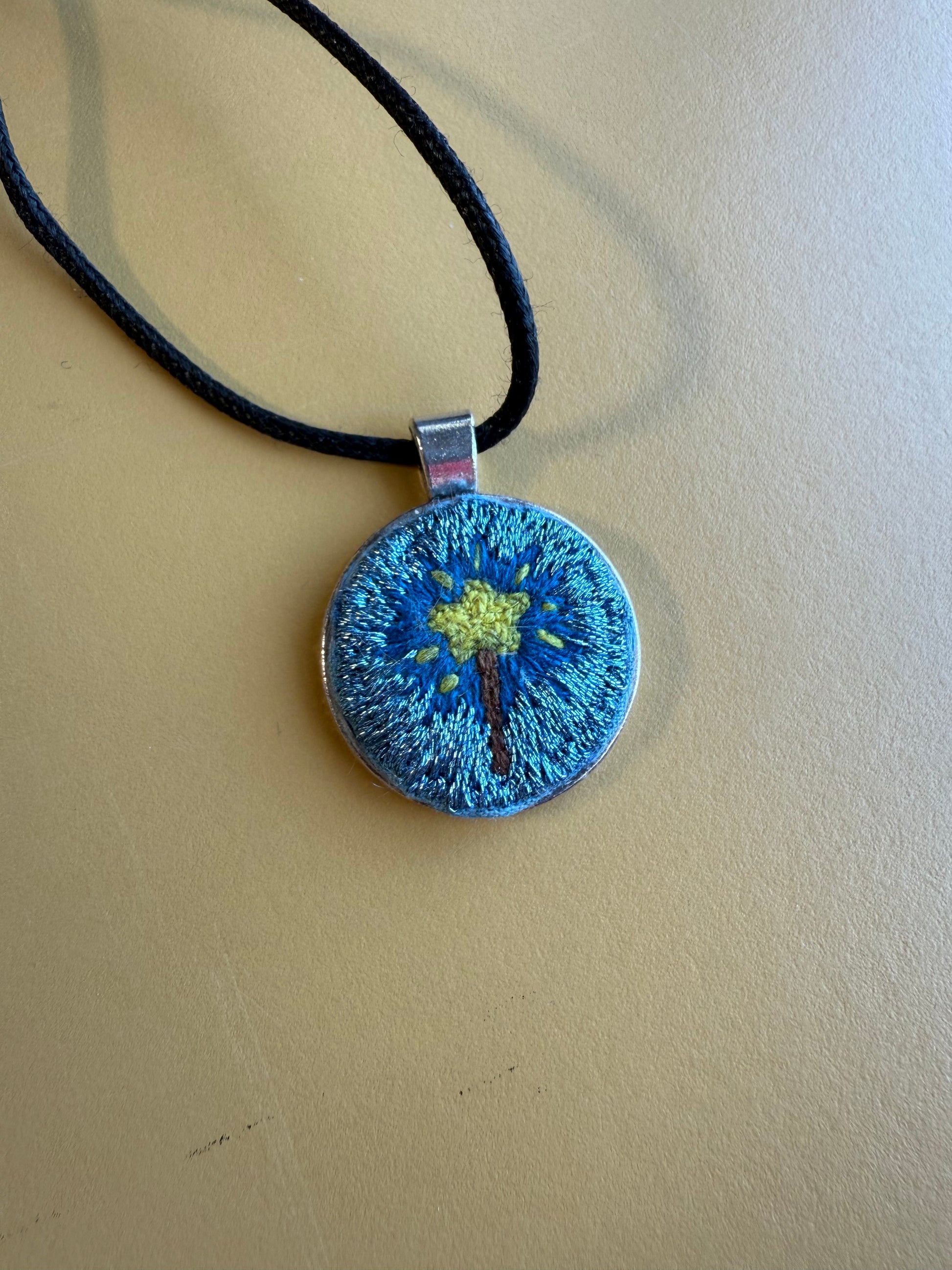 Hand embroidered necklace picturing a magic, star shaped, wand. Surrounded be metallic blue thread