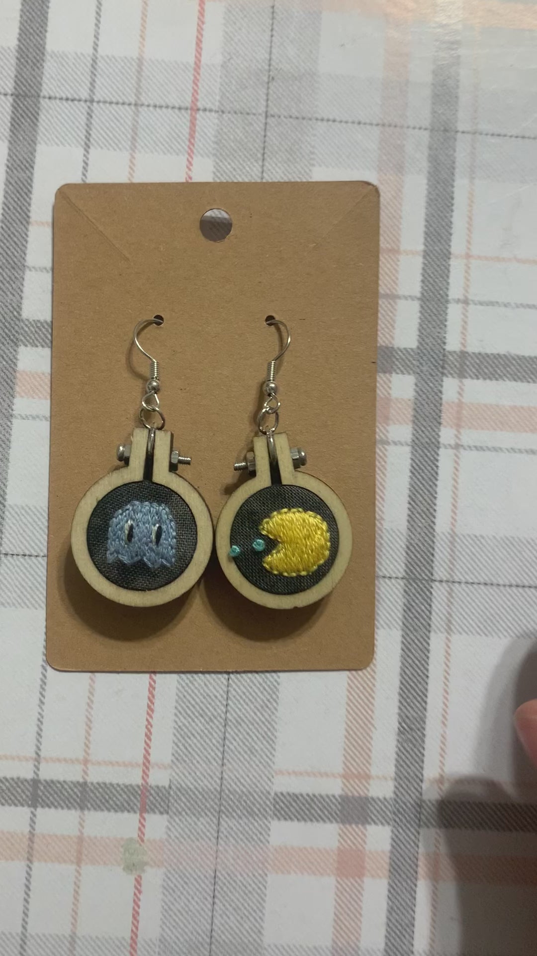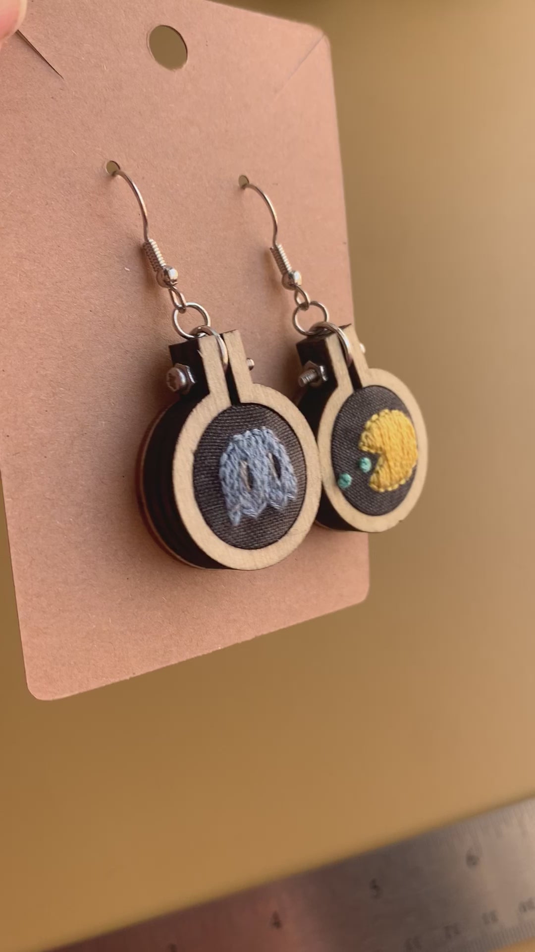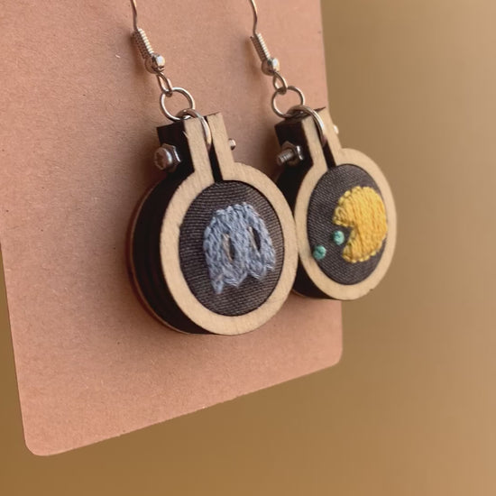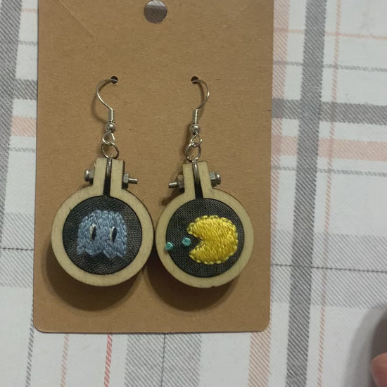 Hand embroidered earrings featuring Pac-Man on one and a ghost on the other.